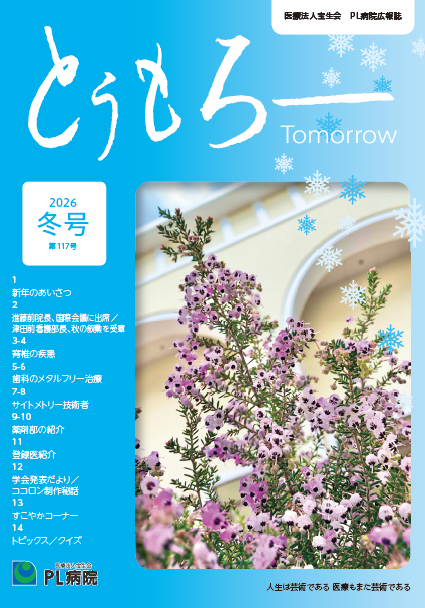 新年のあいさつ進藤前院長、国際会議に出席津田前看護部長、秋の叙勲を受章脊椎の疾患歯科のメタルフリー治療サイトメトリー技術者薬剤部の紹介登録医紹介学会発表だよりすこやかコーナートピックス/クイズ